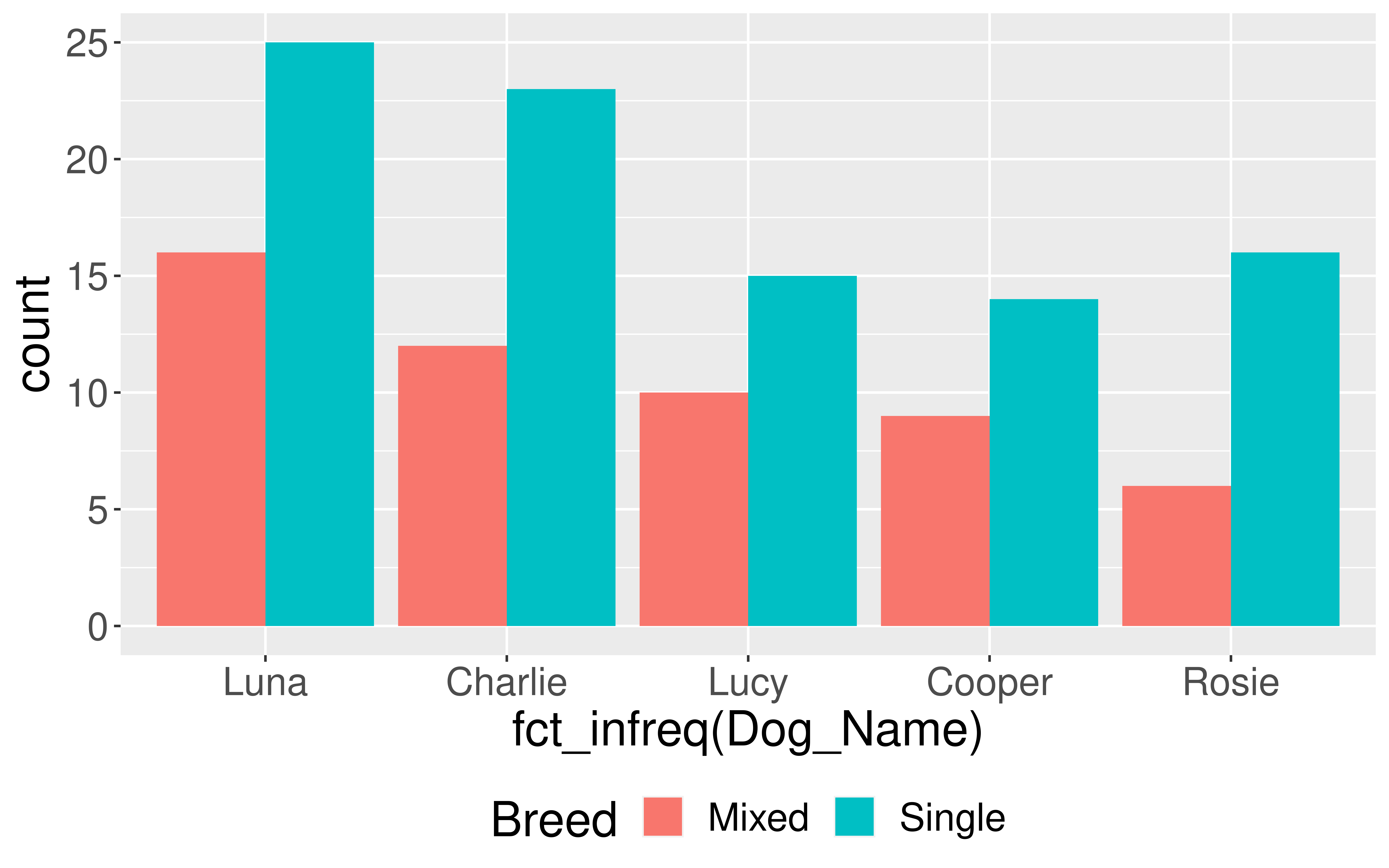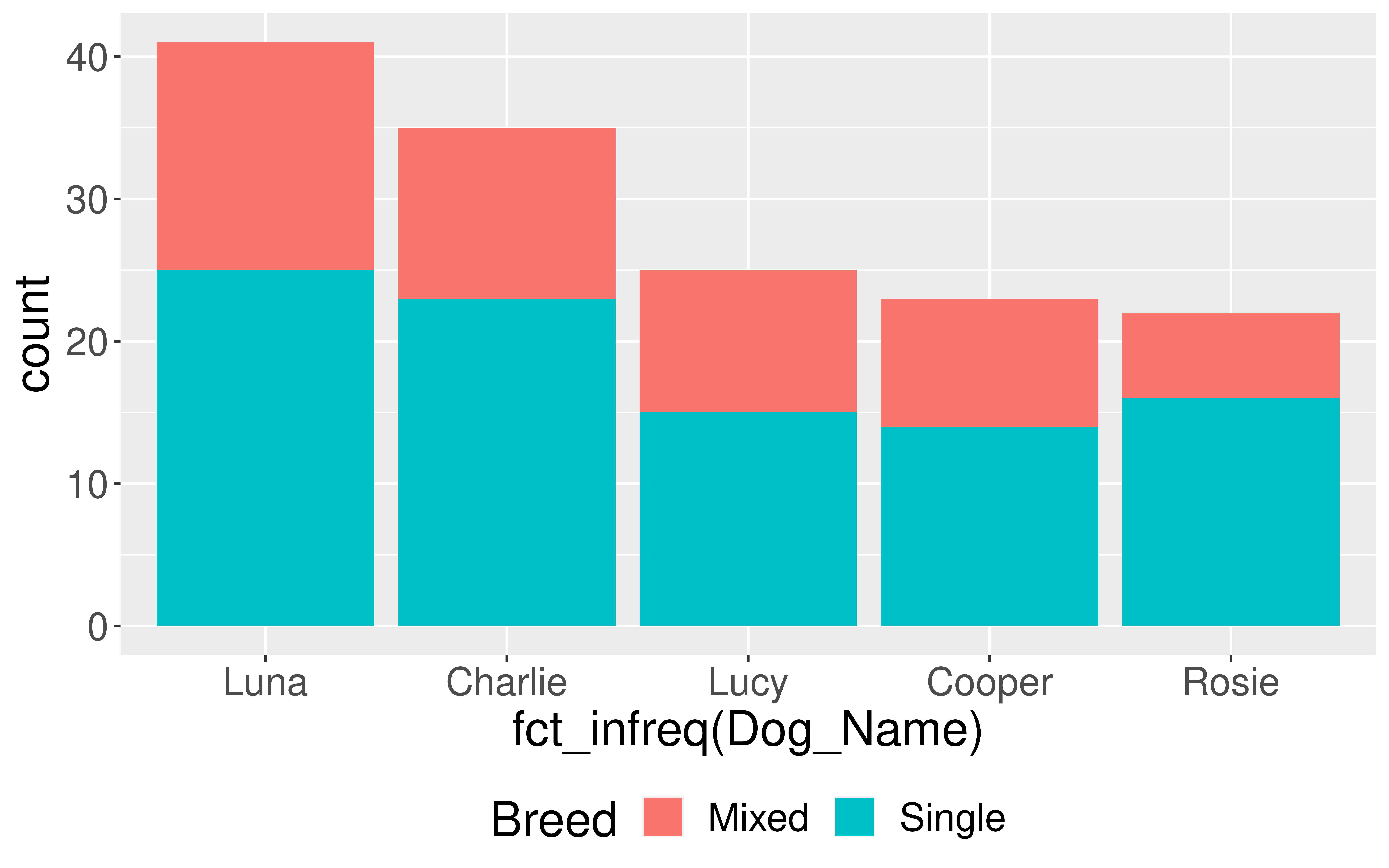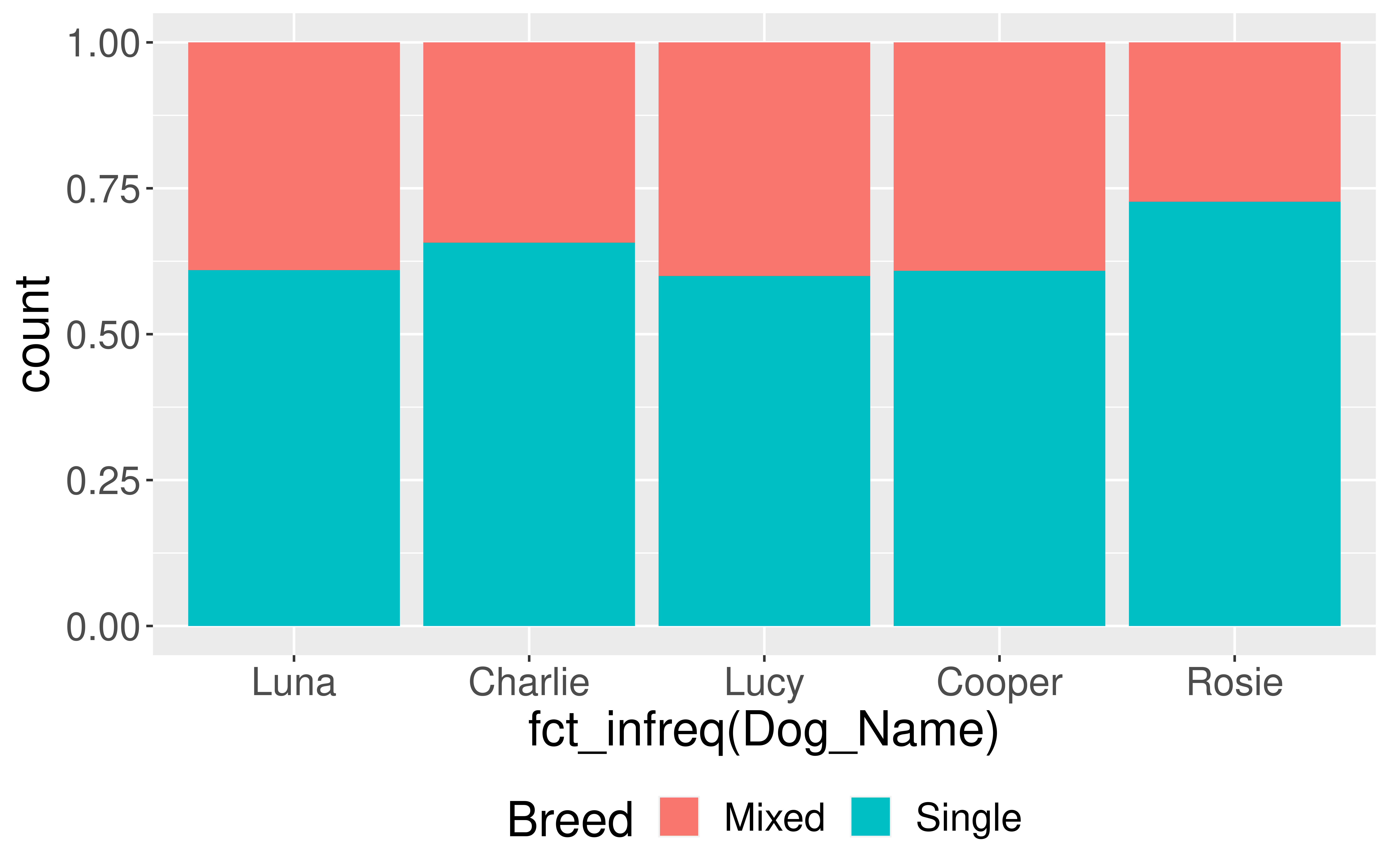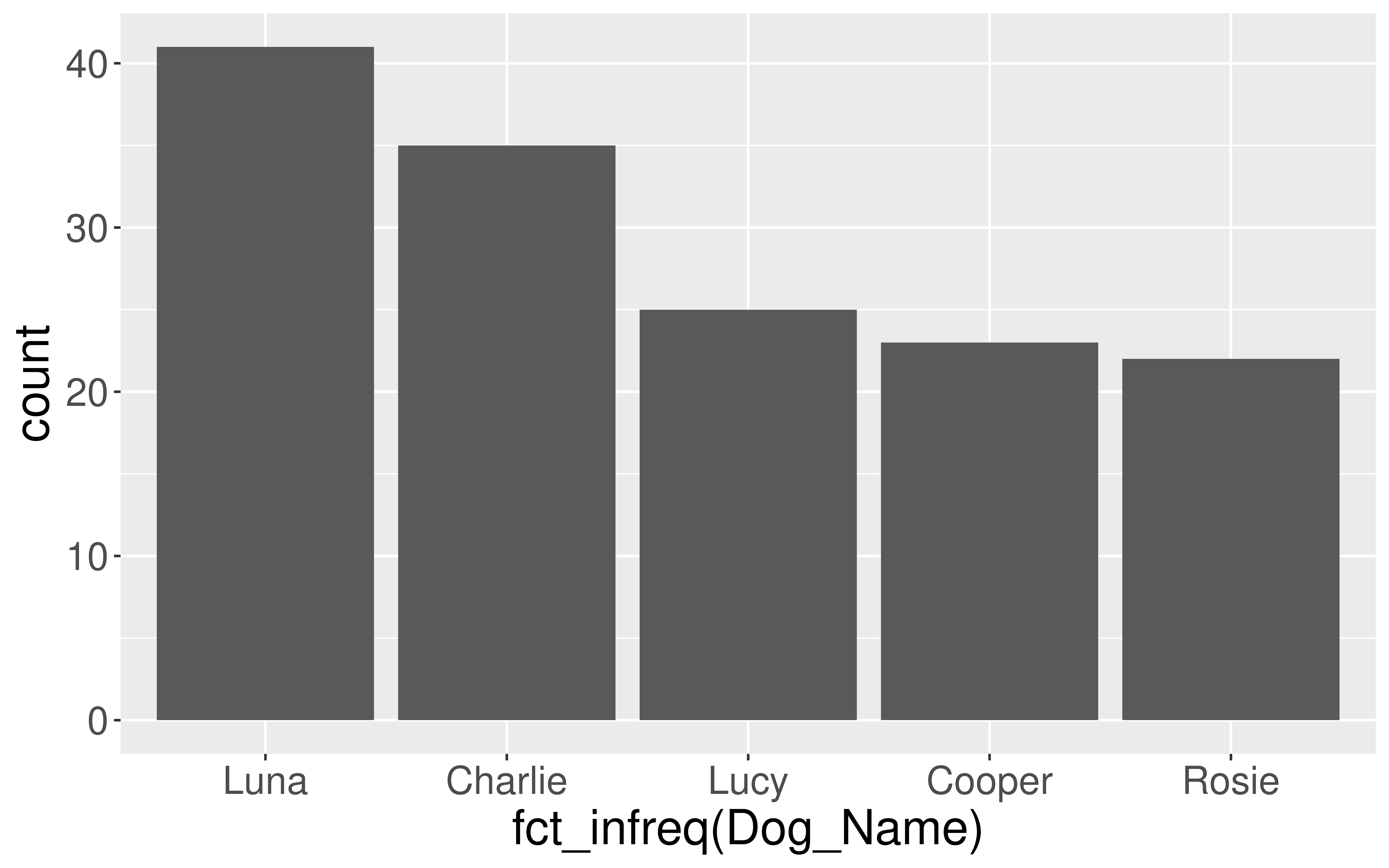 Dog_Name %in% top5names)Displays the frequency for each category.