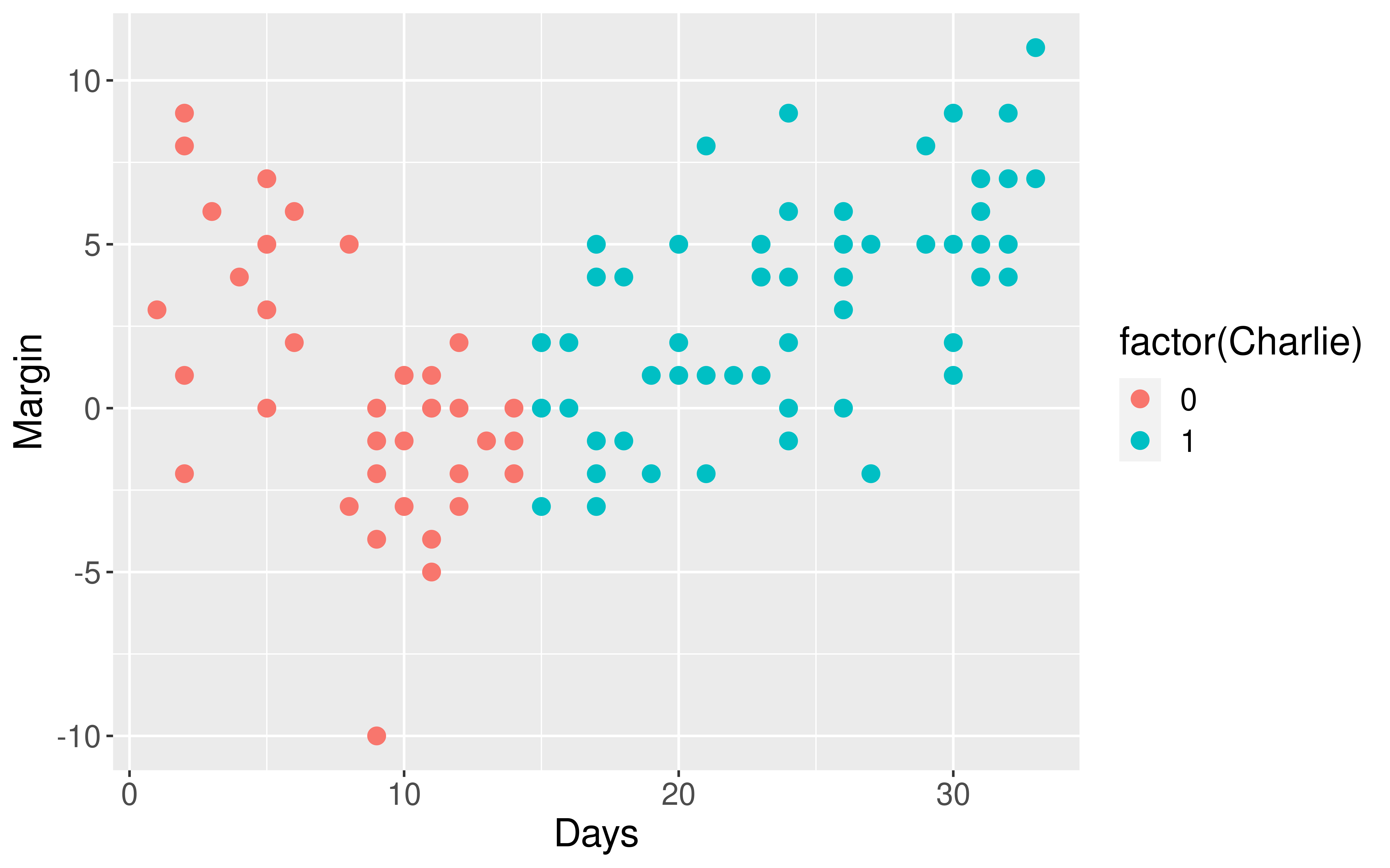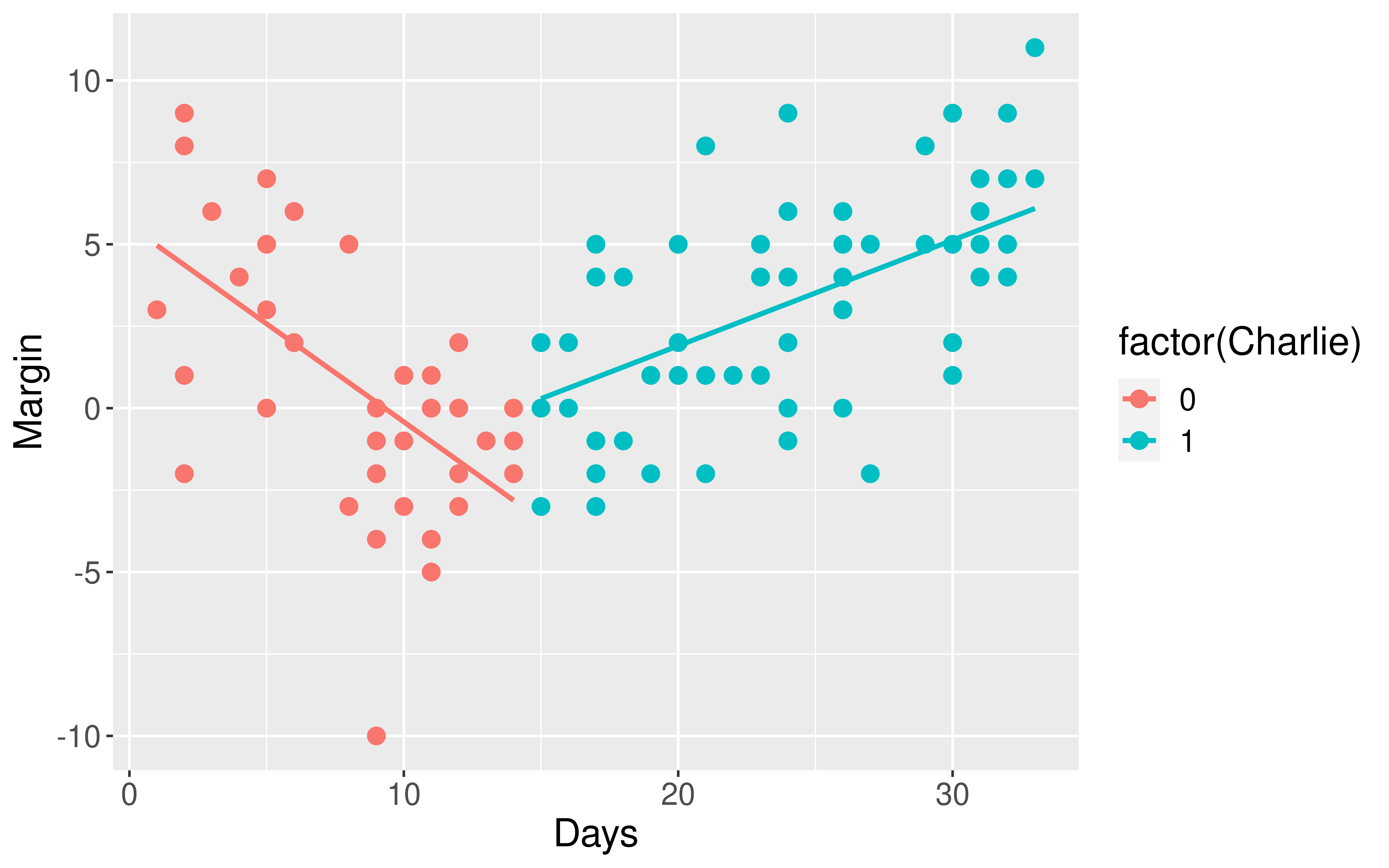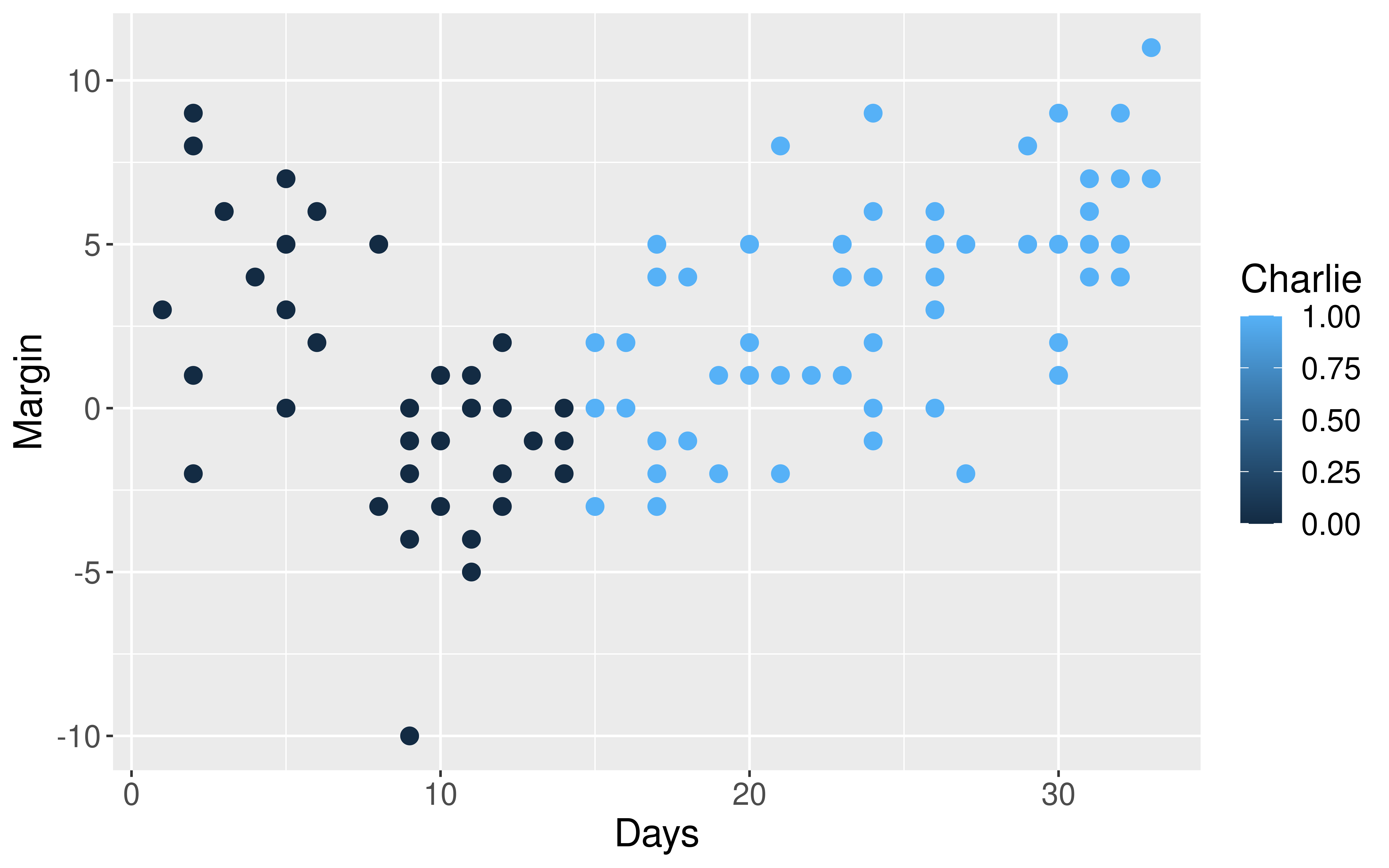 For this example, we will use data collected by the website pollster.com, which aggregated 102 presidential polls from August 29th, 2008 through the end of September. We want to determine the best model to explain the variable Margin, measured by the difference in preference between Barack Obama and John McCain. Our potential predictors are Days (the number of days after the Democratic Convention) and Charlie (indicator variable on whether poll was conducted before or after the first ABC interview of Sarah Palin with Charlie Gibson).