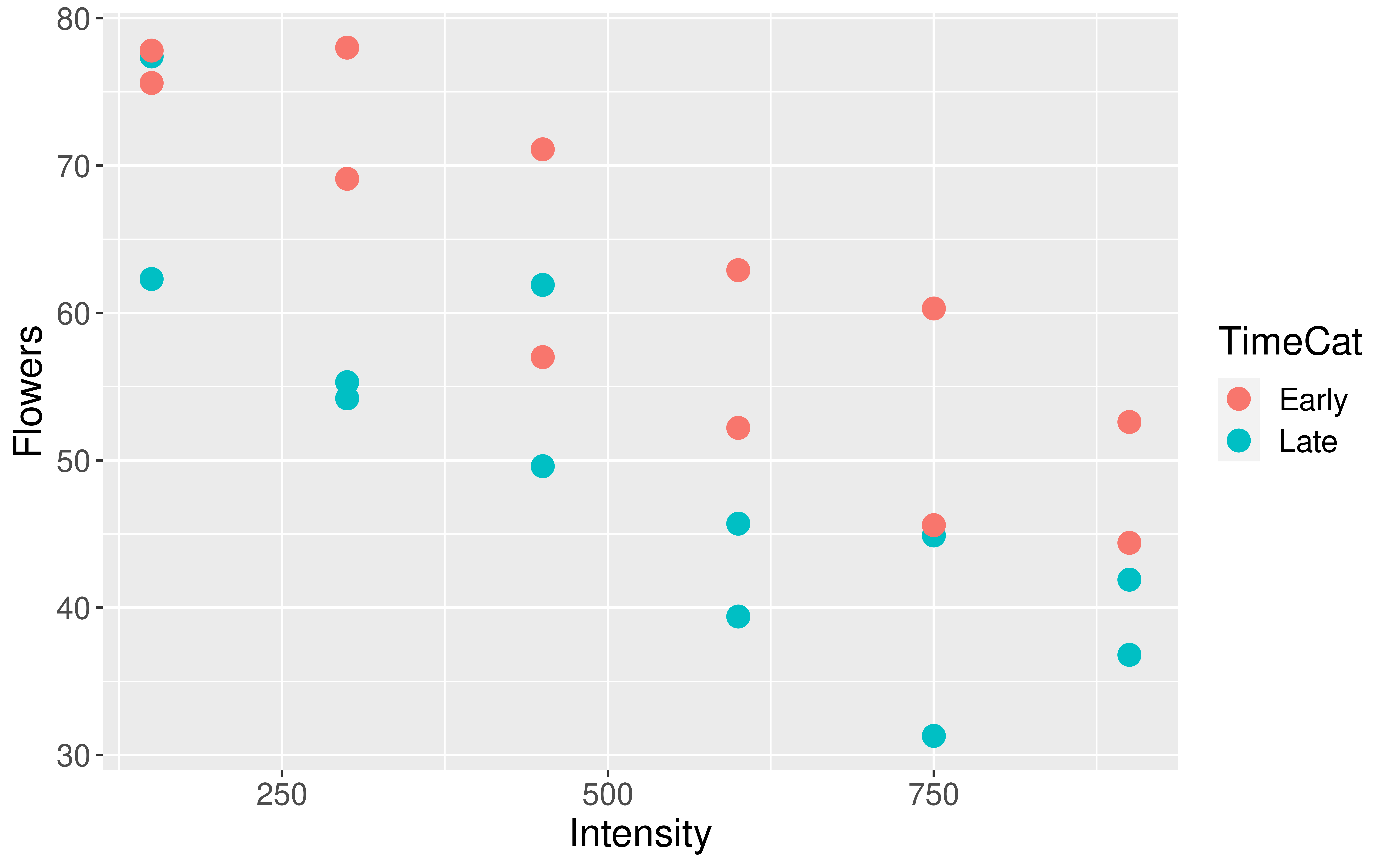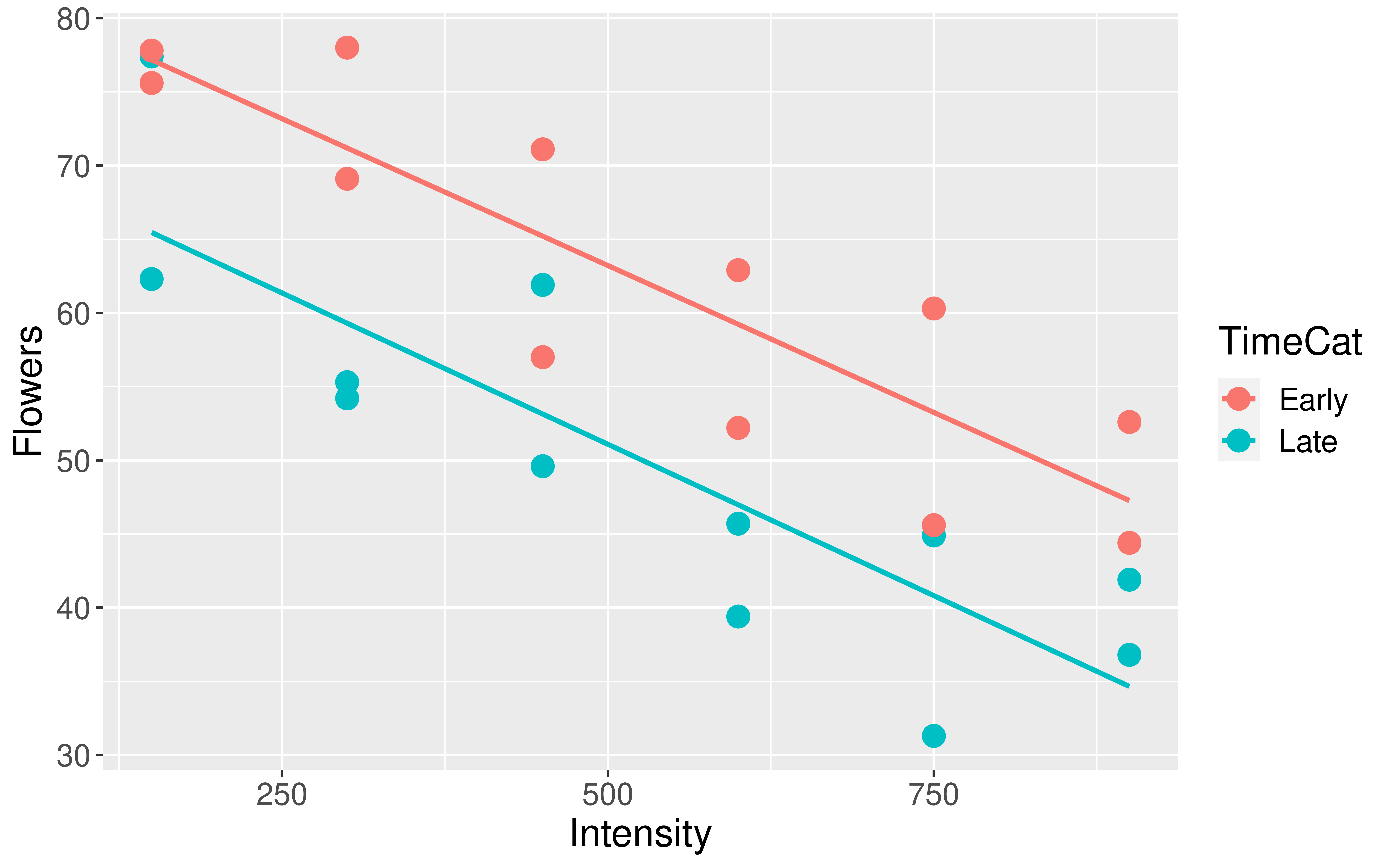 modFlowers <- lm(Flowers ~ Intensity + TimeCat, data = case0901)