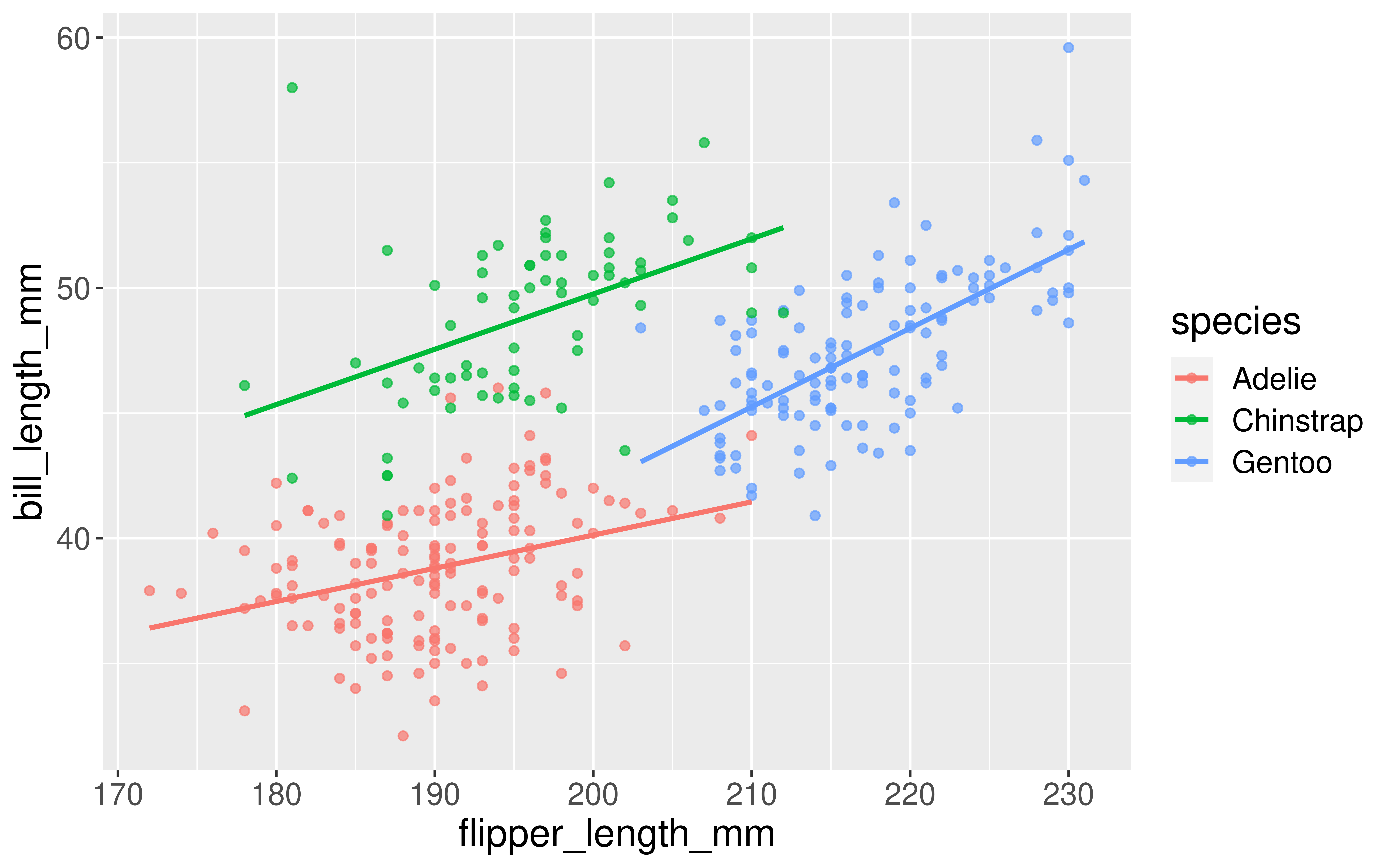mod2 <- lm(bill_length_mm ~ flipper_length_mm * species, data = penguins)