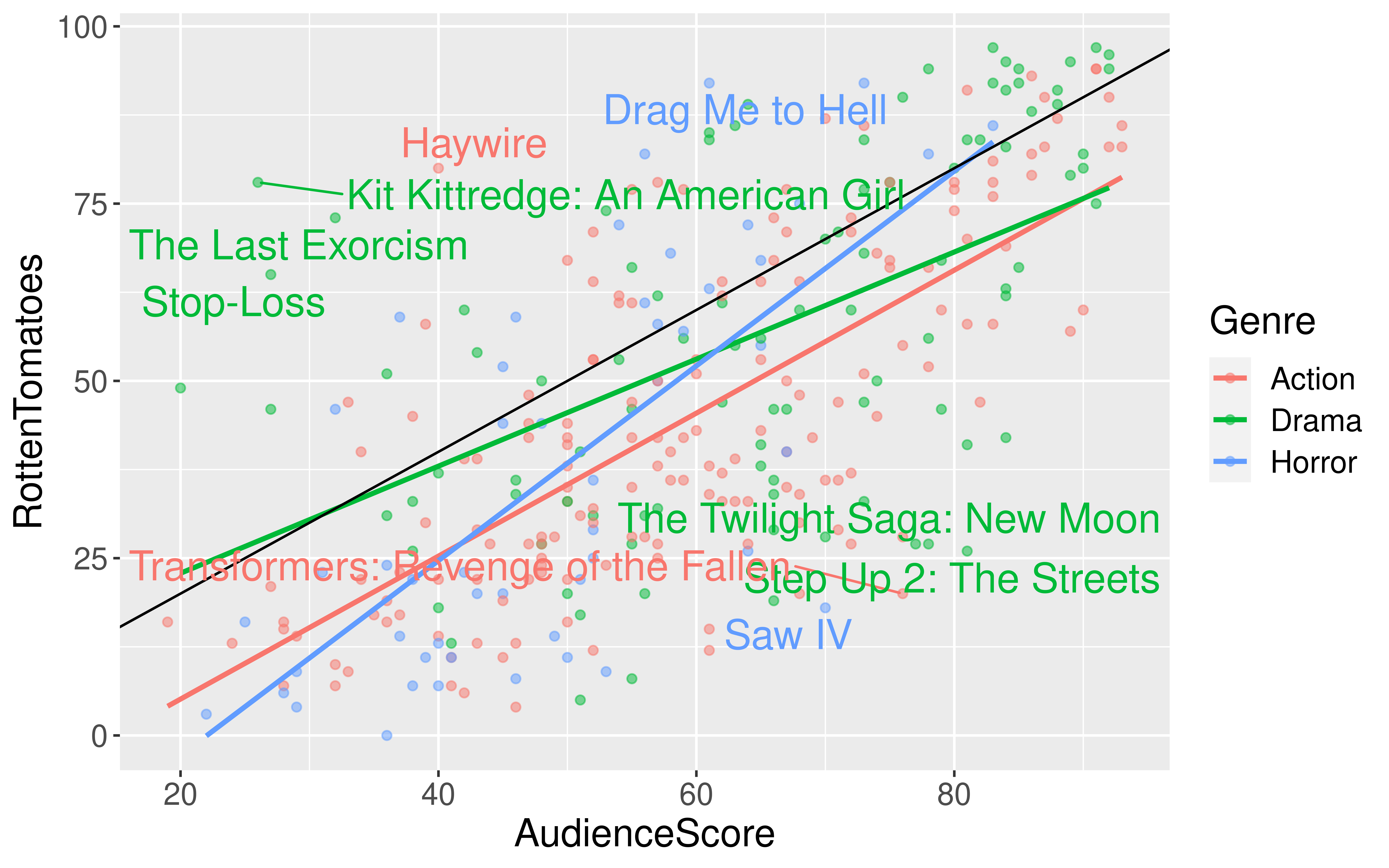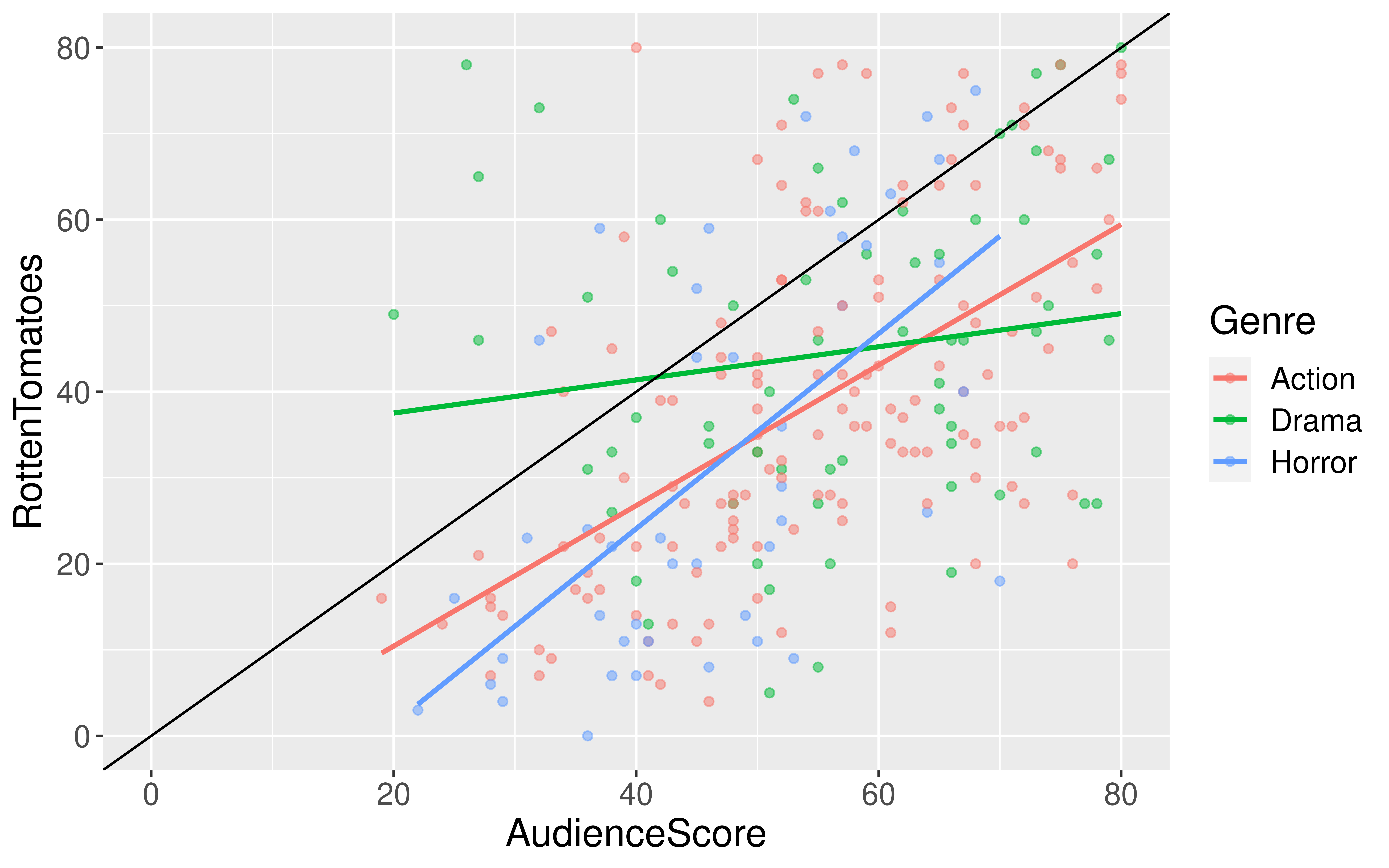 Let’s model a movie’s critic rating using the audience rating and the movie’s genre.